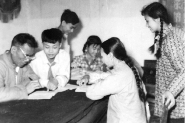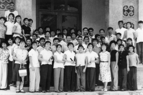 1980年演出的《梁山伯与祝英台》第三场 “书馆谈心” 剧照,左三是饰演祝英台的陈小珠,右一是饰演老师的卫太平,右二是饰演梁山伯的李汉铭,左一是饰演同学的黎庆焕,左二是饰演同学的田艺学。