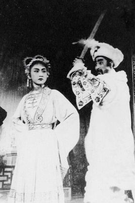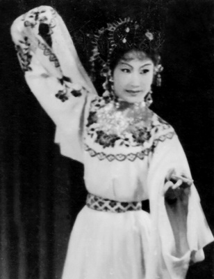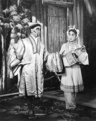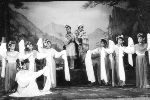 1959年演出的《百鸟衣》剧照。右一是饰演依妮的陈小珠,左一是饰演古卡的张祖基。 |