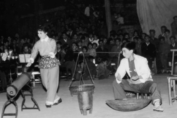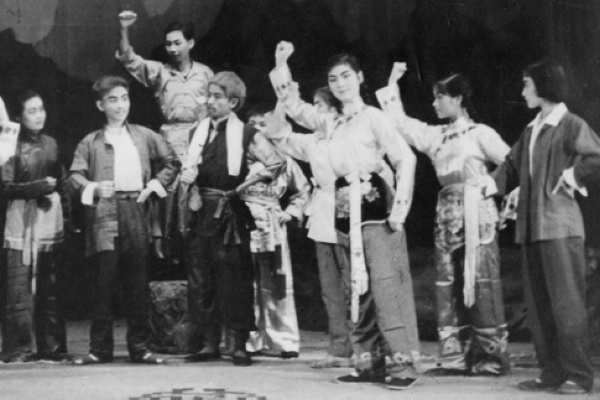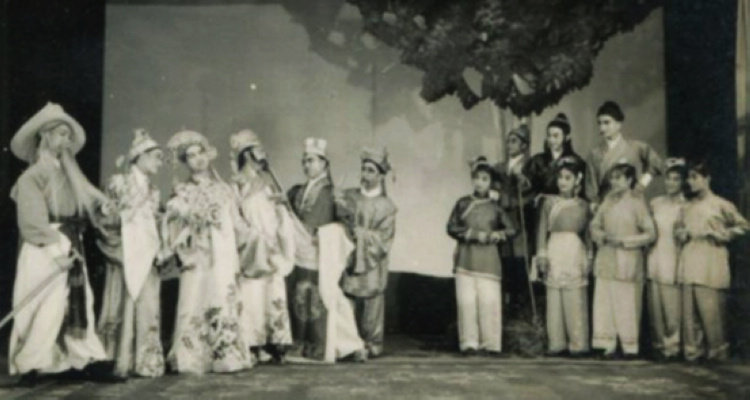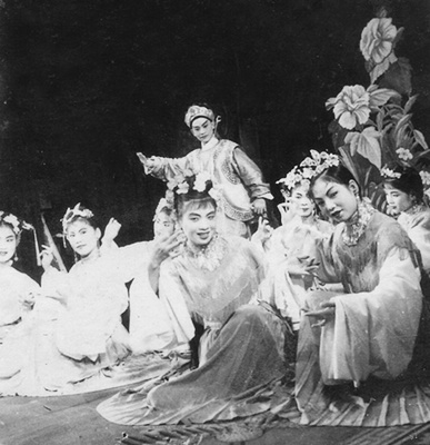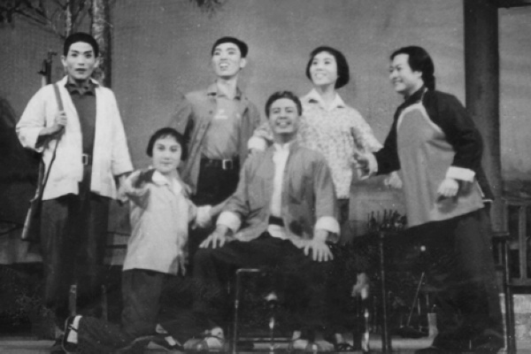 1959年演出的《刘三姐》 尾场 剧照。右一是饰演小牛的张祖基,右二是饰演刘三姐的陈小珠。