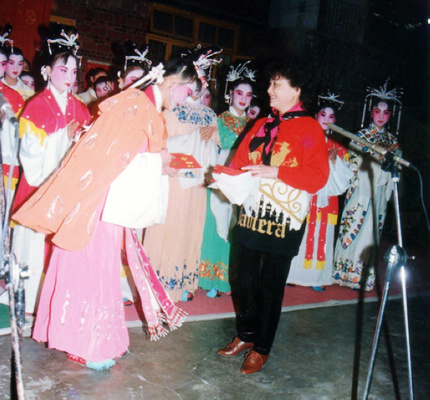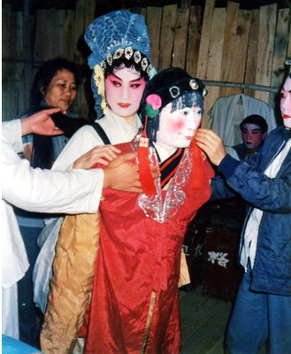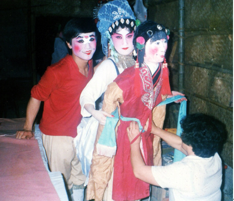 1988年在苍梧沙头演出《哑女告状》,上演前,服装员卢秀珍为陈小珠扎假人,扮演呆大的刘英明也来凑热闹。