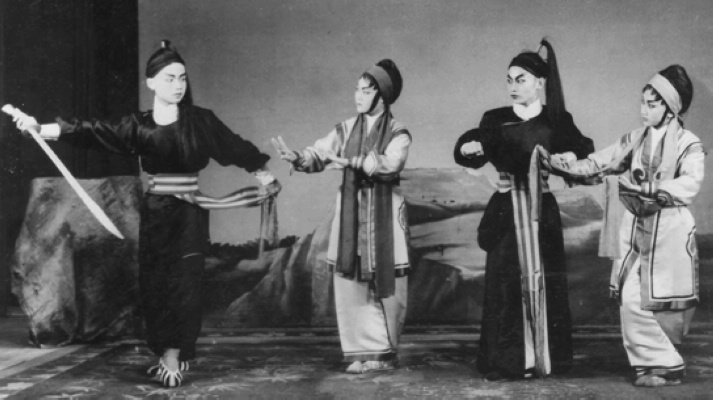 1959年演出的《双结缘》第一场“打虎”剧照。 右一是饰演司马素英的陈小珠,右二是饰演冯俊安的张祖基,右三是饰演司马大年的欧阳绍,右四是饰演司马海的林炳坤, 右五是饰演冯秀霞的利飞, 右六是饰演司马平的易锦全, 扮演老虎的是易锦荣。