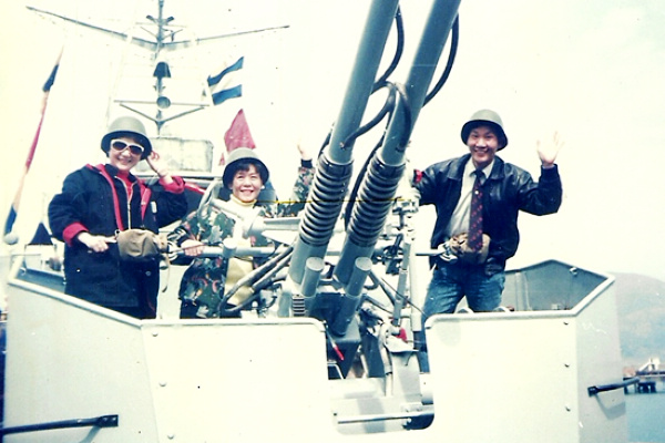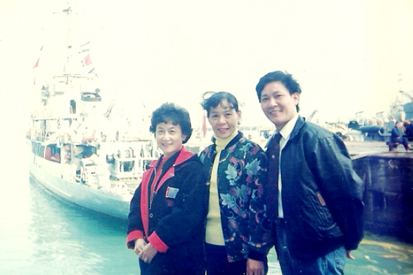 八十年代随梧州市人民政府慰问团到台山广海慰问海军“梧州舰”官兵时的照片。左一是陈小珠、左二是李小玲、左三是罗国樑。 hr