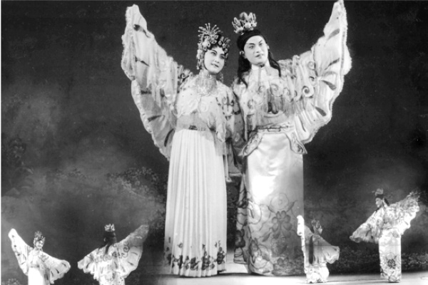 1980年演出的《梁山伯与祝英台》第九场“化蝶”剧照,右一是饰演梁山伯的李汉铭,左一是饰演祝英台的陈小珠。