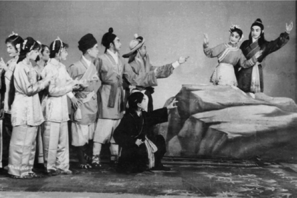 1980年演出的《梁山伯与祝英台》第四场“十八相送”剧照。右一是饰演祝英台的陈小珠,左一是饰演梁山伯的李汉铭。