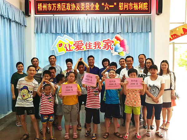 万秀区政协机关干部、委员企业家和福利院孩子们留影合照。 5月30日上午,在“六一”儿童节来临之际,万秀区政协主席严锦雄率万秀区政协机关干部职工及委员企业家一行9人,到市社会福利院看望慰问孤残儿童,并为他们送上由政协机关和广西梧州日新塑料实业有限公司、广西忠德科技集团有限公司、梧州大益商务服务有限公司等政协委员企业捐赠的8000元慰问金及节日的祝福。 在市福利院院长的陪同下,委员们听取了工作人员对孤残儿童基本情况介绍,详细了解孩子们日常的学习、生活等方面的情况以及面临的困难问题,并鼓励孩子们要积极乐观地面对生活,树立信心,希望孩子们健康快乐成长。严锦雄表示,这里的孩子们需要社会各界更多、更无私的关爱与呵护,我们要让孩子们感受到社会对他们的关爱,使他们能够健康快乐的成长。 同行的市政协委员、日新塑料实业有限公司总经理甘惠贞表示:“关注民生、关爱弱势群体是作为政协委员应积极承担的社会责任,也是企业文化中不可或缺的一环,我们要做出社会表率,并使之成为企业新常态。希望能够给予福利院孩子们力量,帮助他们茁壮成长,让社会更加温暖。” 随后,委员们还与孩子们一同欢乐地唱起了《感恩的心》,跳起欢快的《小苹果》,现场气氛活跃,其乐融融,伴孩子们提前度过了一个愉快的“六一”儿童节。 (万秀区政协办公室) |