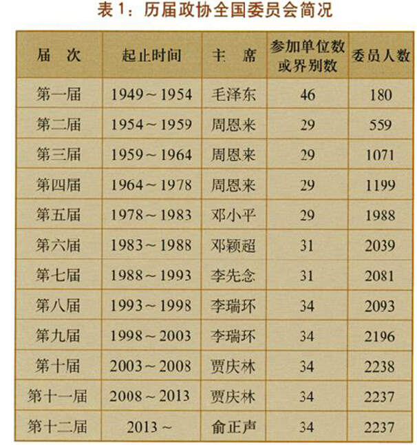 中国人民政治协商会议设全国委员会和地方委员会。 全国委员会 政协全国委员会由中国共产党、各民主党派、无党派人士、人民团体、各少数民族和各界的代表,香港特别行政区同胞、澳门特别行政区同胞、台湾同胞和归国侨胞的代表以及特别邀请的人士组成。 政协全国委员会每届任期五年,设主席、副主席若干人、秘书长。历届政协全国委员会简况如表1。