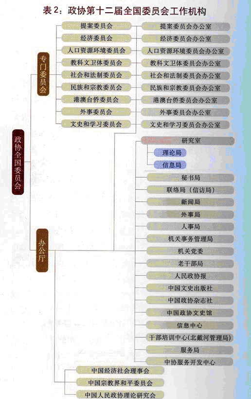 7、决定中国人民政治协商会议全国委员会工作机构的设置和变动,并任免其领导成员。 1、提案委员会 2、经济委员会 3、人口资源环境委员会 4、教科文卫体委员会 5、社会和法制委员会 6、民族和宗教委员会 7、港澳台侨委员会 8、外事委员会 9、文史和学习委员会 全国委员会设办公厅,在秘书长领导下进行工作;设副秘书长若干人,协助秘书长进行工作。政协第十二届全国委员会工作机构如表2。 hr